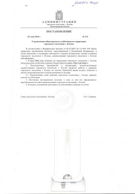 ПОСТАНОВЛЕНИЕ № 270 от 03 мая 2018 г. О проведении общегородского субботника на территории городского поселения г. Котово 03.05.2018
